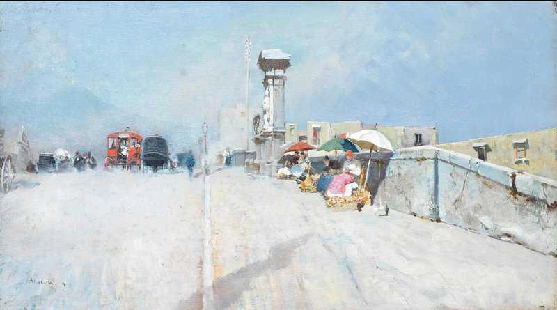 아틸리오 프라텔라(1856~1949)는 생동감 넘치는 풍경과 도시 풍경으로 유명한 존경받는 이탈리아 화가였습니다. 에밀리아로마냐주 루고에서 태어난 프라텔라는 일찍부터 예술에 관심을 보였고 볼로냐 미술 아카데미에서 정식 교육을 받았습니다. 그의 재능 덕분에 그는 나폴리 미술 아카데미에서 학업을 계속할 수 있는 장학금을 받았고, 나폴리는 그의 예술적 경력의 중심지가 되었습니다.