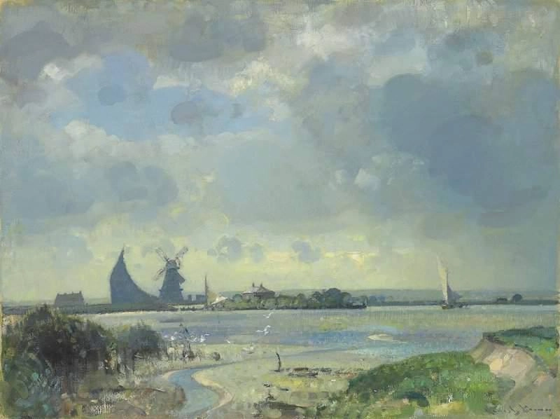 John Alfred Arnesby Brown (1866-1955) was een gevierd Engels schilder die bekend stond om zijn suggestieve landschappen en zijn belangrijke bijdrage aan de Tonalisme beweging in Groot-Brittannië. Zijn werken weerspiegelden vaak een poëtische connectie met de natuur, waarbij hij de rustige schoonheid van het landelijke Engeland vastlegde met een unieke gevoeligheid voor licht, atmosfeer en kleur. Browns stijl, sterk beïnvloed door de impressionistische beweging, onderzocht de relatie tussen licht en kleur, wat hem onderscheidde van veel van zijn tijdgenoten.