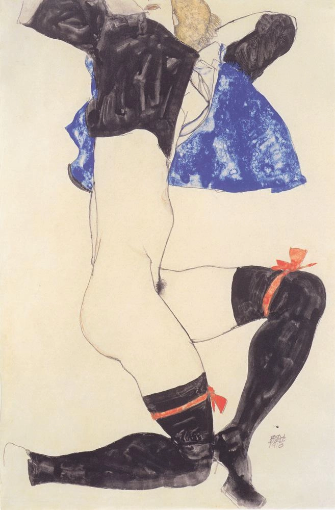 Полуобнаженная в черных колготках и синей куртке — 1913 год. от Эгон Шиле — репродукция на холсте